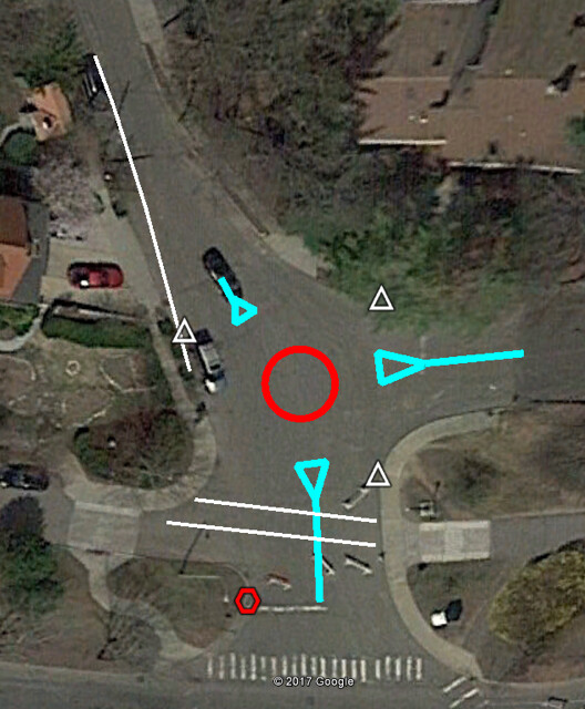 Soon after the stop sign request was turned down, John Pelletier suggested a roundabout here back. See his drawing directly below.