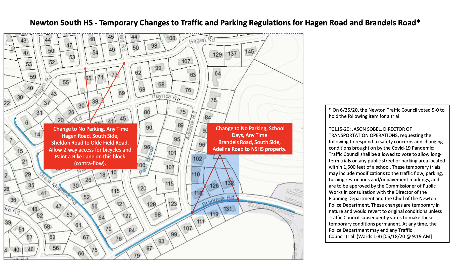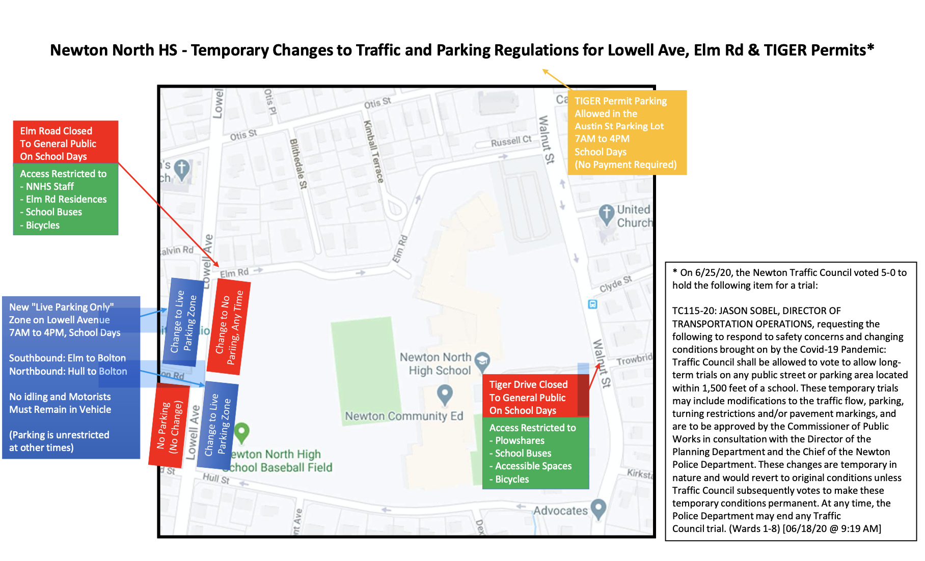 TC115-20: JASON SOBEL, DIRECTOR OF TRANSPORTATION OPERATIONS, requesting the following to respond to safety concerns and changing conditions brought on by the Covid-19 Pandemic: Traffic Council shall be allowed to vote to allow long- term trials on any public street or parking area located within 1,500 feet of a school. These temporary trials may include modifications to the traffic flow, parking, turning restrictions and/or pavement markings, and are to be approved by the Commissioner of Public Works in consultation with the Director of the Planning Department and the Chief of the Newton Police Department. These changes are temporary in nature and would revert to original conditions unless Traffic Council subsequently votes to make these temporary conditions permanent. At any time, the Police Department may end any Traffic Council trial. (Wards 1-8)