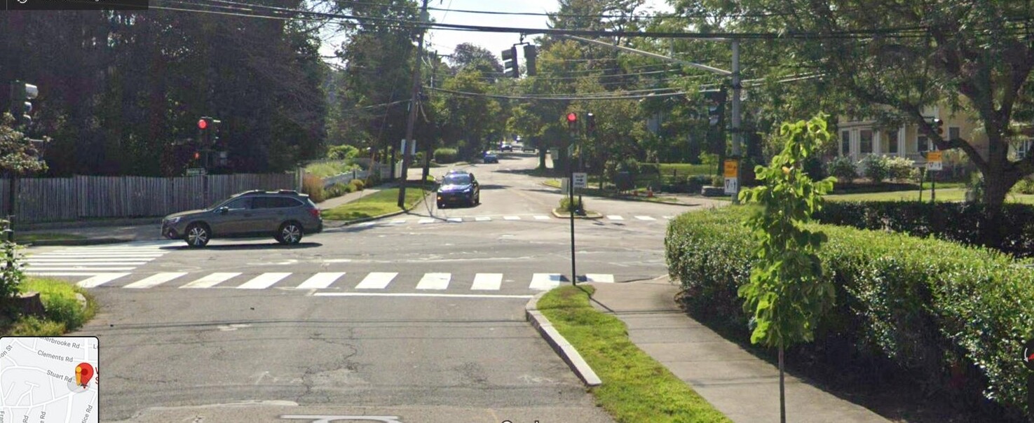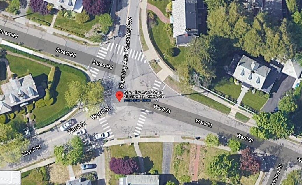 Here is the view from a driver exiting Stuart. As you can see, the driver exiting Stuart, wanting to head east onto Ward, is exactly directed toward the westbound lane of Ward, ie straight into a car headed any one of 3 directions (north up Waverly, east onto Ward, west onto Ward).